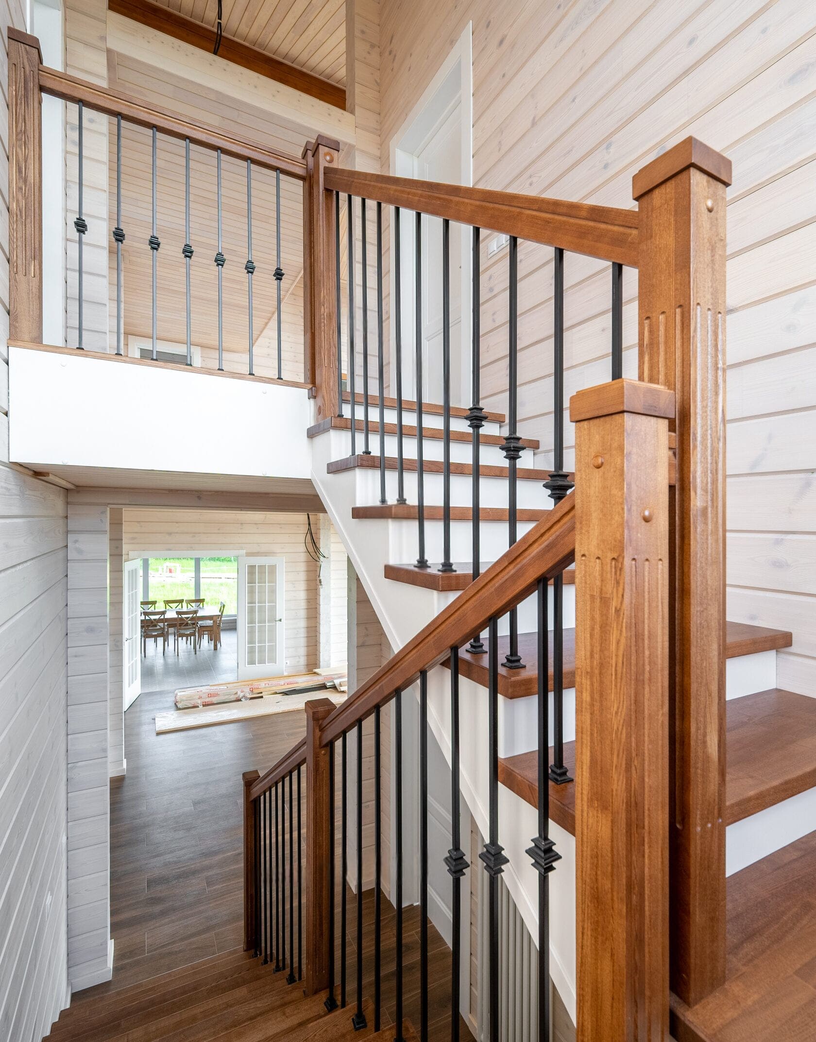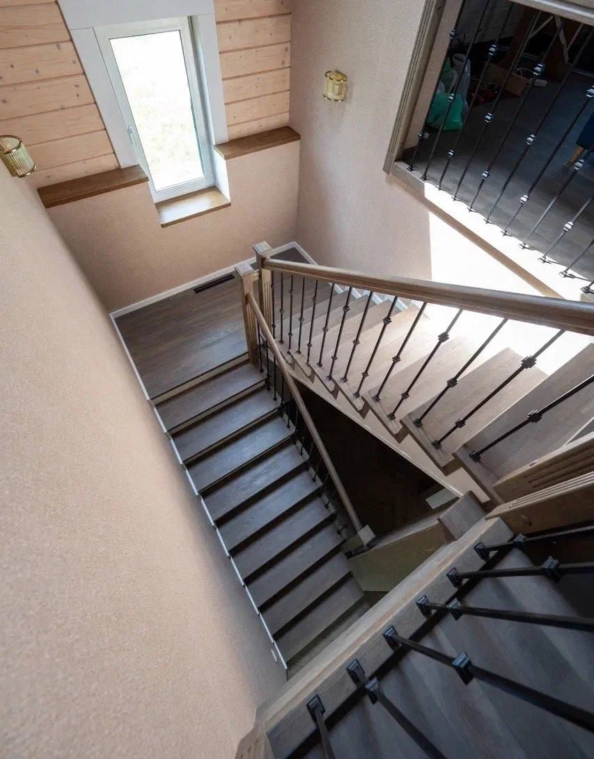 Лестница на металлическом каркасе с первого на второй и небольшая в цокольный этаж.